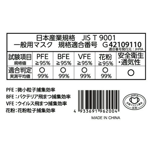 ●使い捨てできる不織布マスク、ふつうサイズ・50枚入です。●捕集効率の高いフィルターを採用しています。●全国マスク工業会マーク付き。●マスク形状/プリーツ型●サイズ/ふつう●寸法/約17.5×9.5cm●色/白●BFE/≧99%●PFE/≧99%●材質/本体:PP、ノーズフィッター:PE、耳紐:PU●生産国/中国●VFE/≧99%●全国マスク工業会認定マーク/あり●JIS T 9001 一般用マスク●1箱=50枚※マスクは感染(侵入)を完全に防ぐものではありません。●メーカー/伊藤忠リーテイルリンク●型番/IRLM-008●JANコード/4933691962004<寸法><一般用JIS規格適合品>※メーカー都合によりパッケージ・仕様等が予告なく変更される場合がございます。ご了承ください。本商品は自社サイトでも販売しているため、ご注文のタイミングにより、発送までにお時間をいただいたり、やむをえずキャンセルさせていただく場合がございます。※沖縄へのお届けは別途1650円(税込)の送料がかかります。